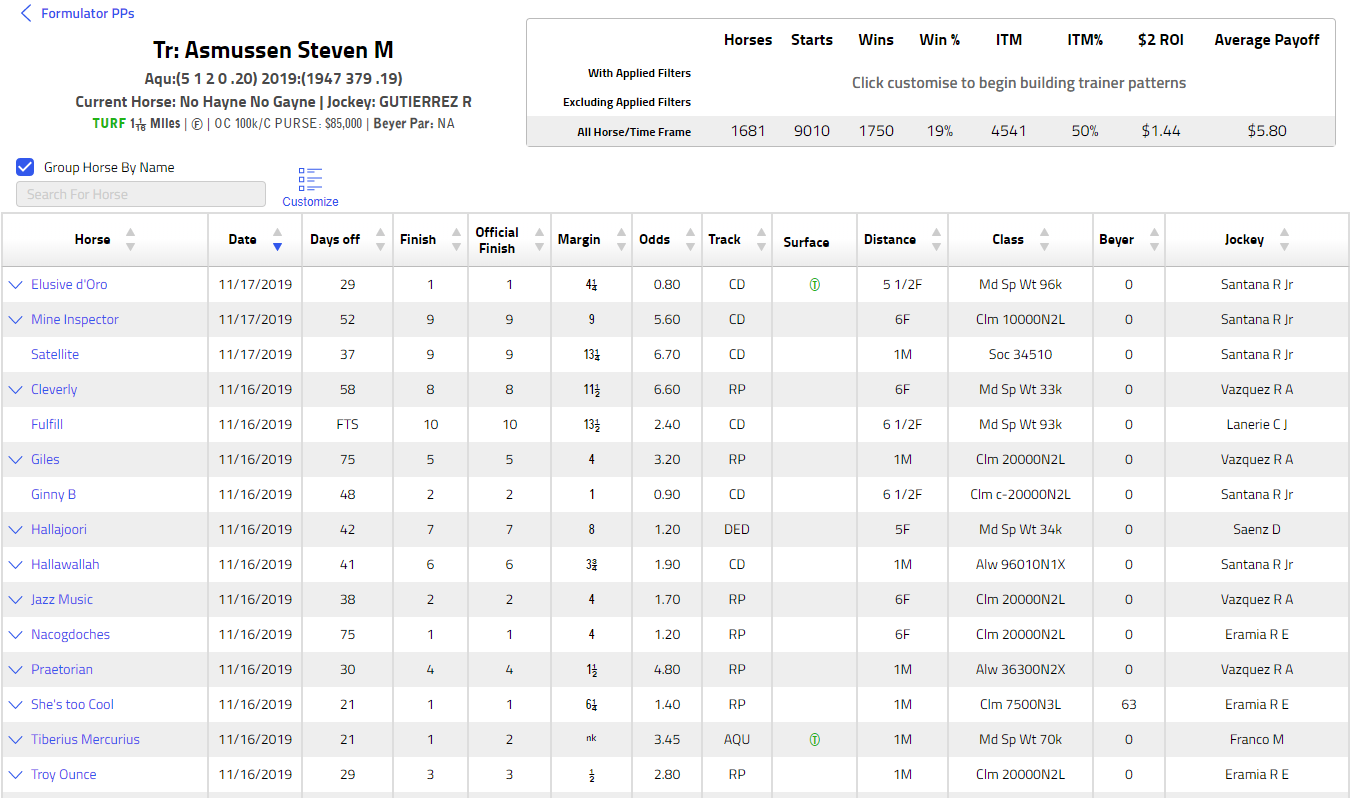 When looking a trainer’s history in the Trainer Pattern Tool, you can sort your results for each category by clicking on the Category header. For example, if you want to sort by “Jockey,” click the word “Jockey.”